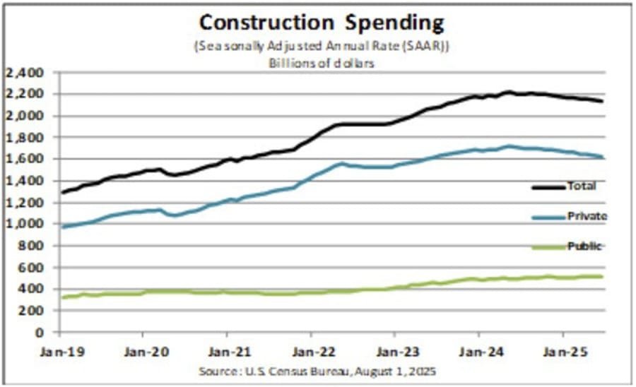 June construction spending declined 0.4% month-over-month, underperforming the flat consensus estimate. It follows a 0.3% decline in May.