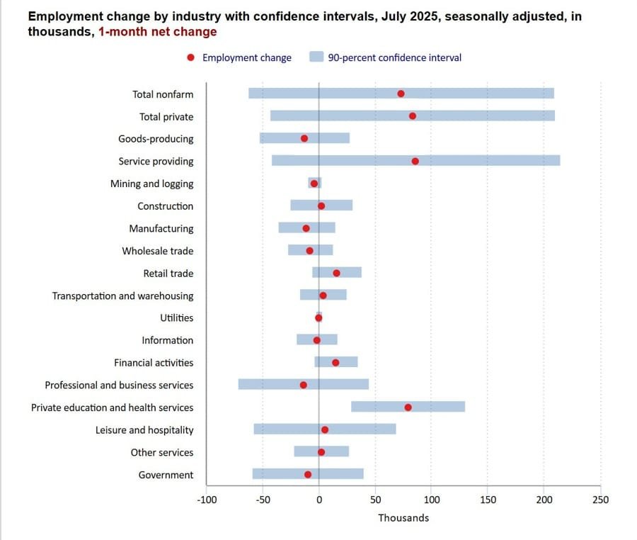 The revised total for the past two months now reflects a net loss of 258,000 jobs. Health care and education added most of July’s gains (+79,000), while sectors like manufacturing, professional services, and wholesale trade saw losses.