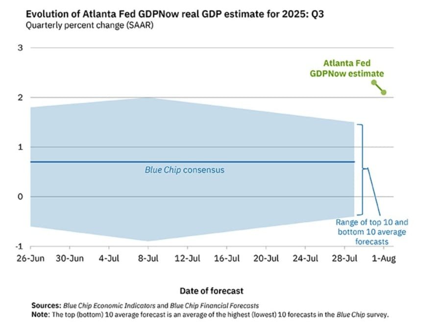 The GDPNow model estimate for real GDP growth (seasonally adjusted annual rate) in the third quarter of 2025 is 2.1 percent on August 1, down from 2.3 percent on July 31. After this morning’s releases from the US Bureau of Labor Statistics, the US Census Bureau, and the Institute for Supply Management, the nowcasts for third-quarter real personal consumption expenditures growth and real private fixed investment growth declined from 1.9 percent and 2.5 percent, respectively, to 1.6 percent and 2.0 percent. These declines were partially offset by an increase in the nowcast of the contribution of inventory investment to third-quarter real GDP growth from 0.63 percentage points to 0.74 percentage points.
