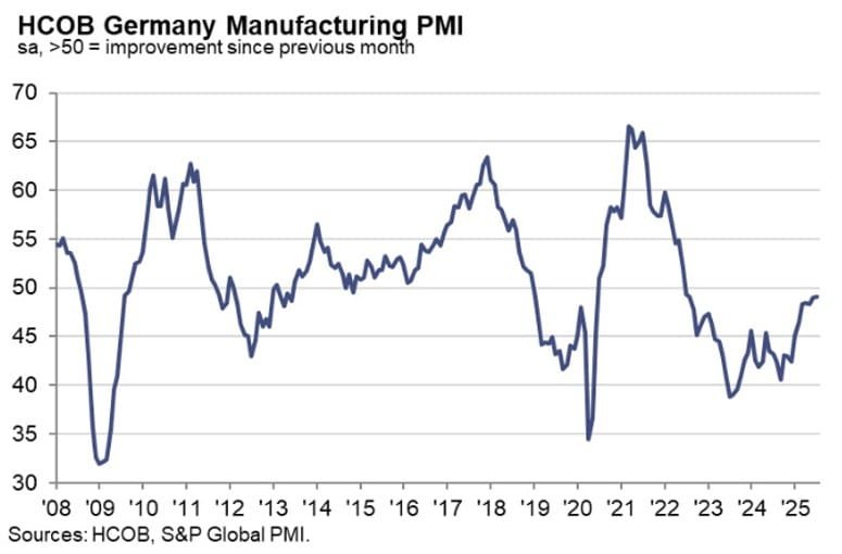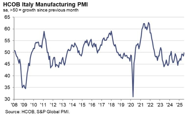 “The downturn at the start of the third quarter in part reflects the passing of a busy period of tariff-related inventory accumulation in prior months. Factories reported little change in inflows of new orders and reduced stock holdings of both raw materials and finished goods in July. This comes after companies had built up inventories in May and June amid concerns over higher import prices and worsening supply availability resulting from tariff hikes.