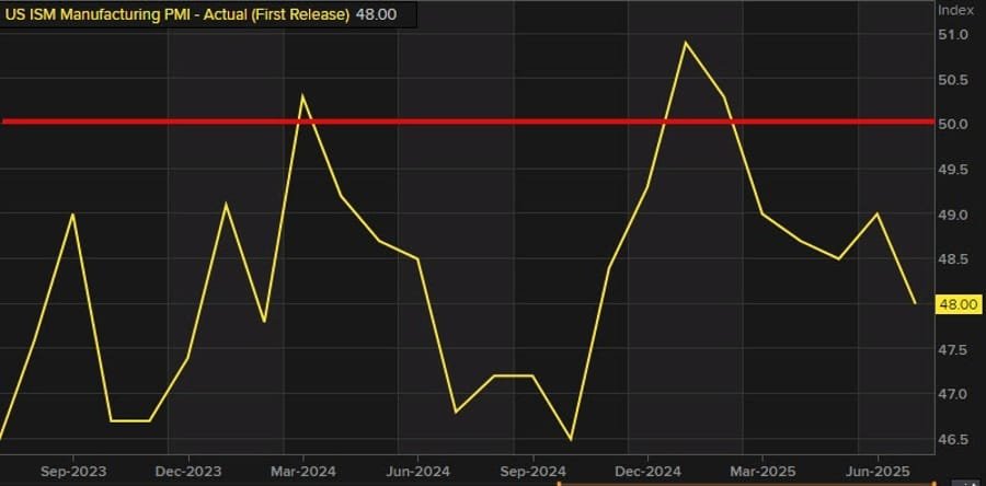The ISM Manufacturing Index dropped to 48.0 in July, missing expectations for a 49.5 reading and falling from 49.0 in June—signaling a deeper contraction in the sector.