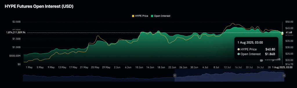 Hyperliquid (HYPE) lost the $40 level, down 22% from its high despite DeFi TVL remaining above $2B.