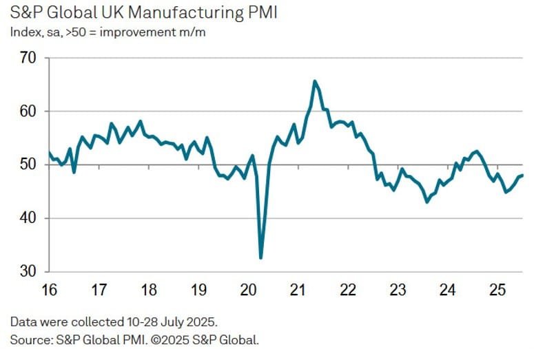 “Input prices continued to rise at a steep rate, with these higher costs often being passed on to customers to drive another month of elevated selling price inflation, but there are signs that these price pressures may have peaked back in June. “Optimism about the year ahead has meanwhile taken a knock as factories worry about reduced demand from customers, especially in export markets, and the inflationary impact of tariffs. Employment consequently fell as factories trimmed headcounts amid concerns over rising costs and lower sales.”