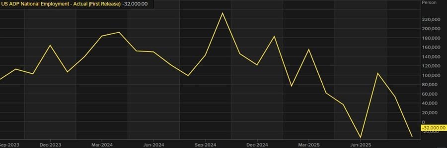 ADP reported that U.S. private payrolls fell by 32,000 in September, a sharp miss compared with expectations of a 50,000 gain. August’s figure was revised down to a 3,000 decline from an earlier +54,000.
