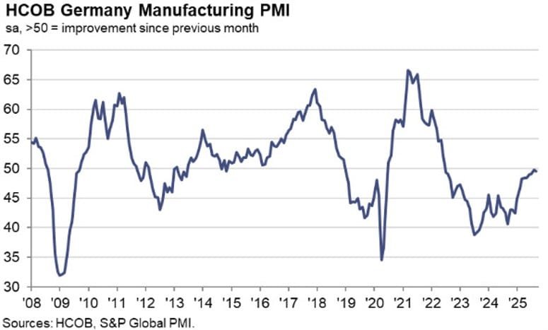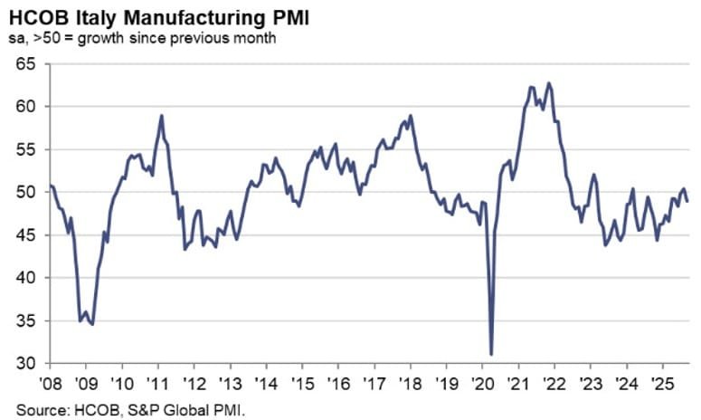 Firms cited soft Chinese demand and U.S. tariffs as major drags. New business fell at its fastest rate since April, while export orders shrank as well. Business confidence slipped to a five-month low, and employment growth slowed.