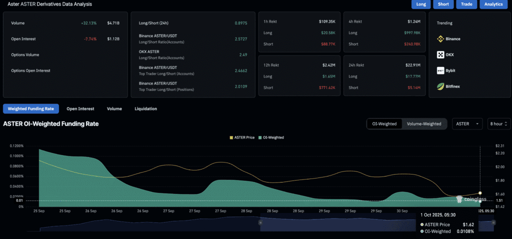 Derivatives data added to bearish signals. CoinGlass reported ASTER open interest dropped 7.74% in the last 24 hours to $1.12 billion, reflecting capital outflows. Funding rates also fell from 0.195% to 0.0108%, pointing to weaker bullish conviction.