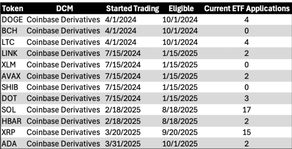 According to Galaxy Research, 10 tokens already qualify, including Bitcoin Cash, Litecoin, Chainlink, Solana, Stellar, Avalanche, Dogecoin, Shiba Inu, Polkadot, and Hedera. XRP and Cardano (ADA) are expected to meet the six-month DCM requirement by September 20 and October 1, respectively.