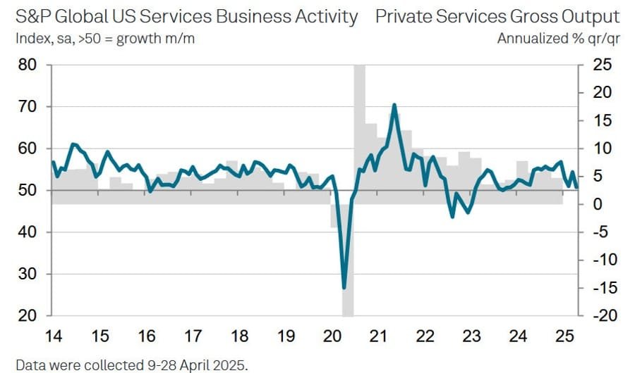 “While tariff announcements mean manufacturing dominates the news, a worrying backstory is developing in the vastly larger services economy, where business activity and hiring have come closer to stalling in April amid plunging business confidence.