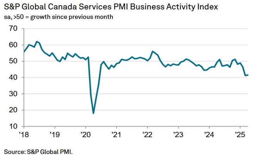 Canada’s economy remains under pressure, with April’s S&P Global Services PMI ticking up slightly to 41.5 from 41.2 — still deep in contraction territory. The composite PMI fell to 41.7, near June 2020 lows.