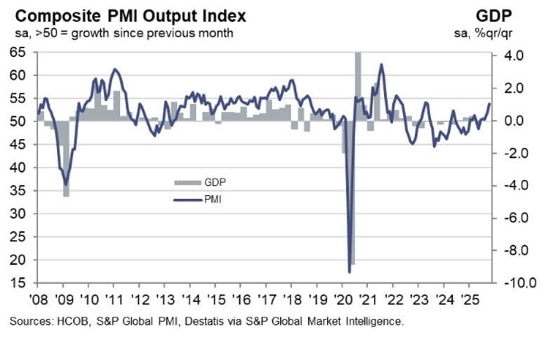 • Eurozone Services PMI: 53.0 — 17-month high, led by Germany, Spain, and Italy.