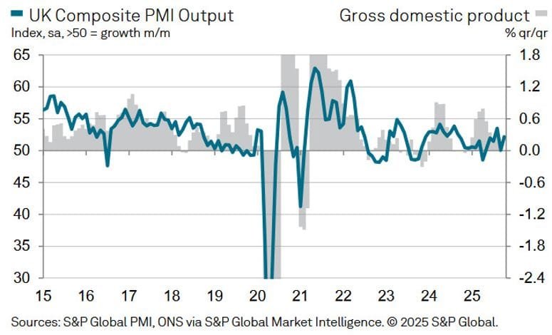 • UK: Services PMI 52.3 — momentum improving; inflation pressures easing.