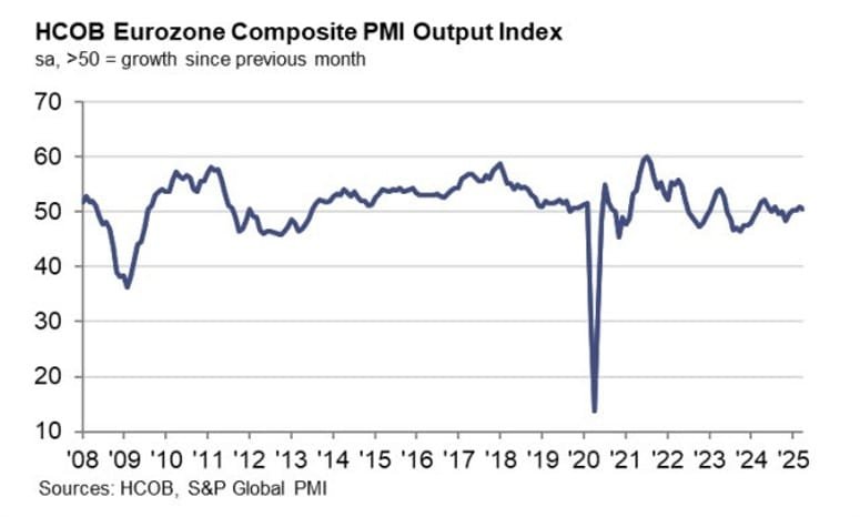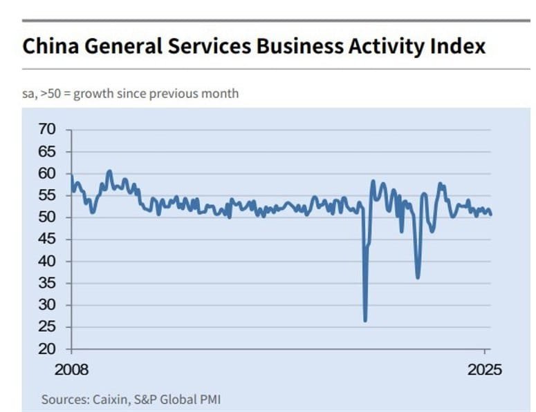 - China’s Services Slow: The Caixin Services PMI fell to 50.7 in April, the weakest since September 2024, as demand weakened and job cuts rose.
