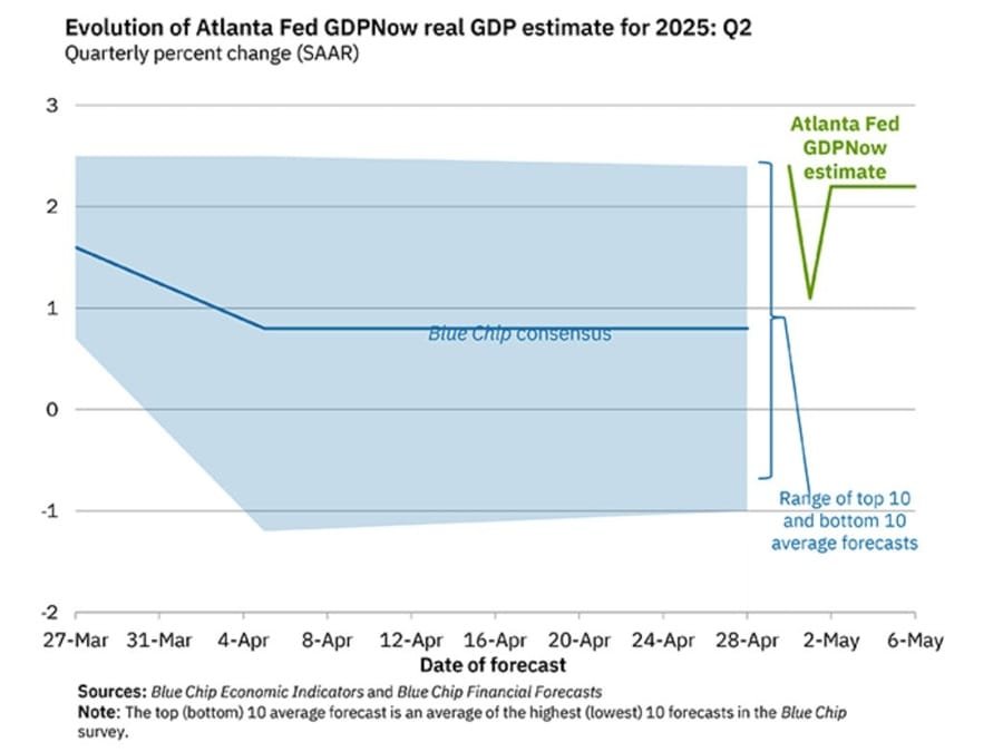 The GDPNow model estimate for real GDP growth (seasonally adjusted annual rate) in the second quarter of 2025 is 2.2 percent on May 6, up from 1.1 percent on May 1. After recent releases from the US Bureau of Labor Statistics, the US Census Bureau, and the US Bureau of Economic Analysis, the nowcasts of second-quarter real personal consumption expenditures growth and real private fixed investment growth increased from 1.9 percent and 1.3 percent, respectively, to 3.3 percent and 3.6 percent.