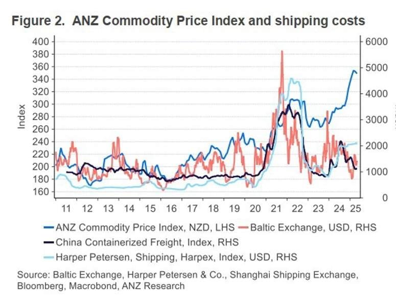 The ANZ World Commodity Price Index held steady in April 2025, unchanged month-over-month. In New Zealand dollar terms, the index fell 1%. The index tracks 17 key export commodities, including dairy, meat, wool, forestry, and seafood. Shipping costs dipped slightly overall, with exporters expecting further declines amid softening global demand. The China Containerized Freight Index was the only measure to show a small rise.