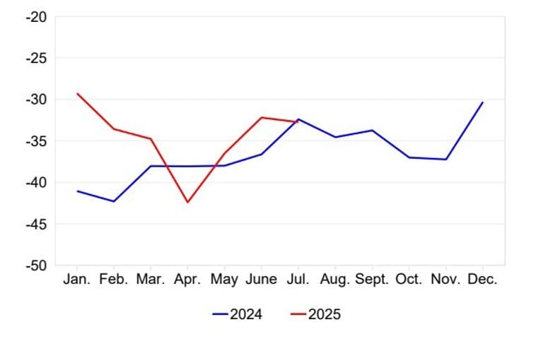 Switzerland’s consumer sentiment index was -32.8 in July, little changed from June’s -32.2, according to SECO data. However, Q3 sentiment has improved to -28 from -39 in Q2. The outlook could darken if US tariffs on Swiss gold — and possibly pharmaceuticals — weigh on exports in the coming months.