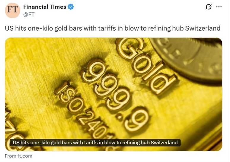 Surprise US tariffs on 1kg and 100oz gold bars from Switzerland sent COMEX futures to record highs, with prices closing at $3,534/oz and widening the gap with London spot prices to over $100. Switzerland refines about 90% of gold from industrial mines, and these bar sizes are standard for COMEX delivery, making US gold more expensive than in overseas markets.