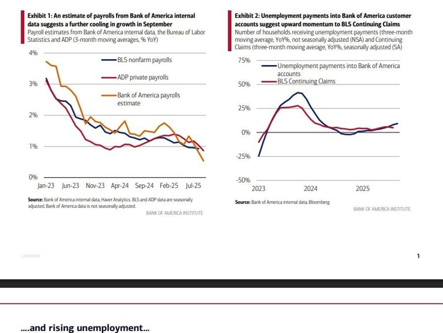 Bank of America’s internal data point to continued cooling in the U.S. labor market during September, with slower job growth and rising unemployment claims.