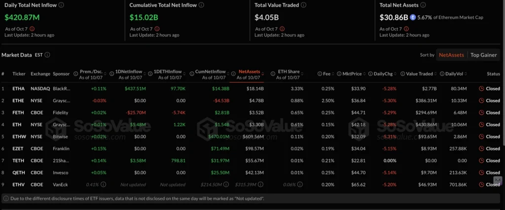Ethereum, however, continued to attract institutional inflows through spot ETFs, which saw $421 million in net inflows on Tuesday — the seventh straight day of gains, according to SoSoValue.
