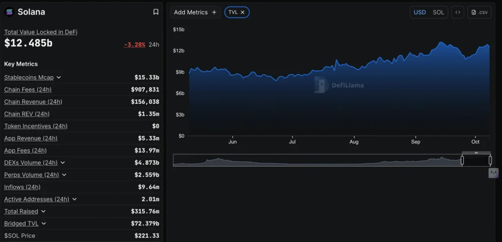 DefiLlama data show Solana’s DeFi Total Value Locked (TVL) fell 3% in the past 24 hours, dropping from $12.91 billion to $12.48 billion, indicating reduced investor confidence.