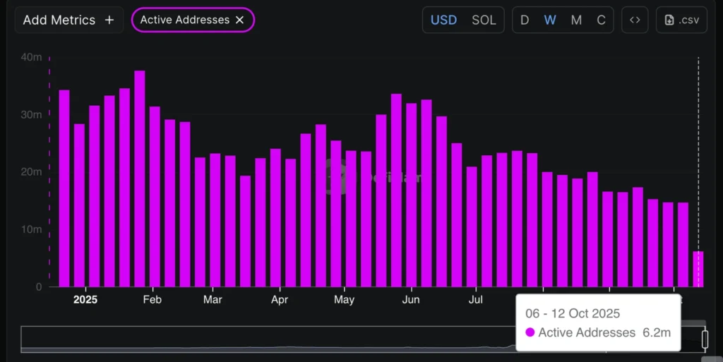 Active addresses on the network have also fallen sharply — to 6.2 million from 33.33 million in May — signaling weaker user engagement. Meanwhile, total weekly transactions declined to 173.72 million from 613.14 million recorded in late July.