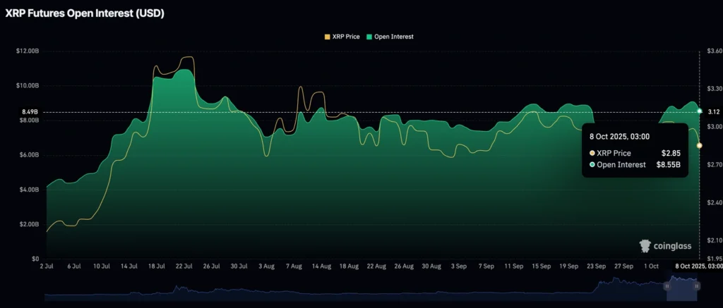 Ripple’s XRP traded in a narrow range on Wednesday, hovering near $2.85, as futures open interest fell to $8.85 billion, reflecting waning retail participation.