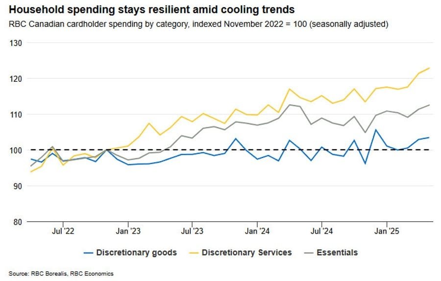 RBC’s proprietary cardholder data indicates retail spending in Canada rose 0.7% in May, extended from a 0.5% April gain. Excluding autos, spending grew 1.1%, while core sales increased 1.2%. Essential services showed a 1.2% uptick, essentials rose 1.1%, and discretionary goods increased by 0.5%. Despite global trade uncertainties, household demand remains resilient, though with signs of slow moderation.
