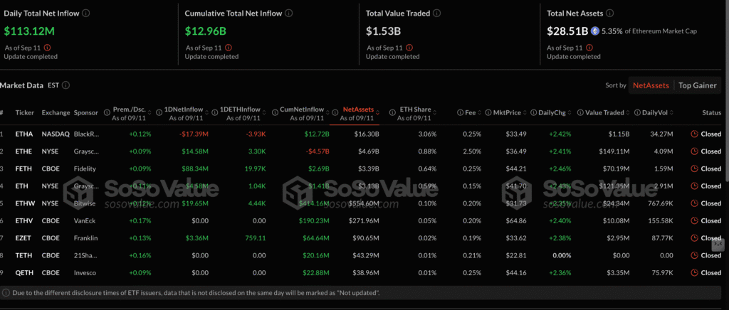 • ETH ETFs posted $113M inflows Thursday, the third straight day of gains after a losing streak, with total net inflows at $12.96B.