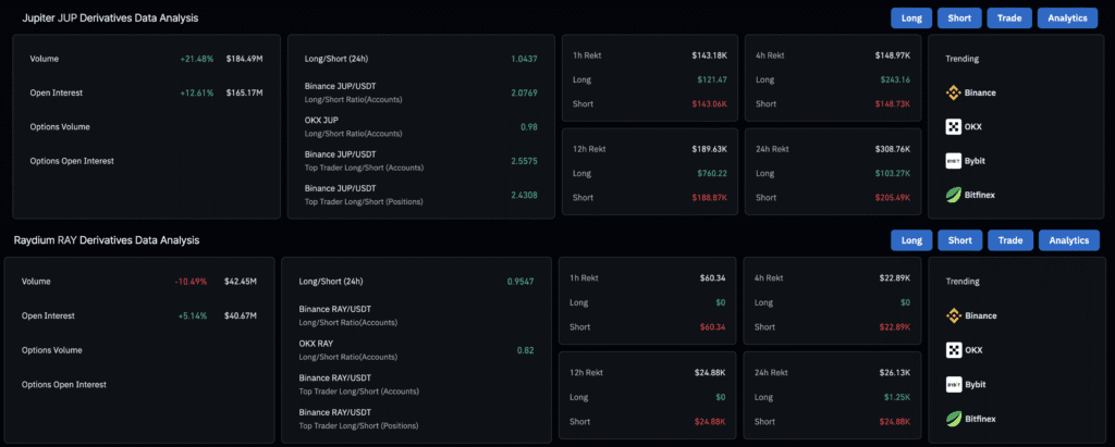 • Open Interest jumped 5% for Raydium ($40.67M) and 12% for Jupiter ($165.17M) (CoinGlass), signaling rising trader conviction.