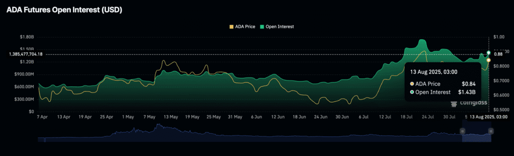 Open interest in Cardano futures jumped to $1.43 billion from $1.2 billion on August 3, reflecting growing investor participation. The increase mirrors a July rally when ADA reached $0.93 and OI peaked at $1.74 billion before easing. A breakout above resistance could clear the path toward $1.00.
