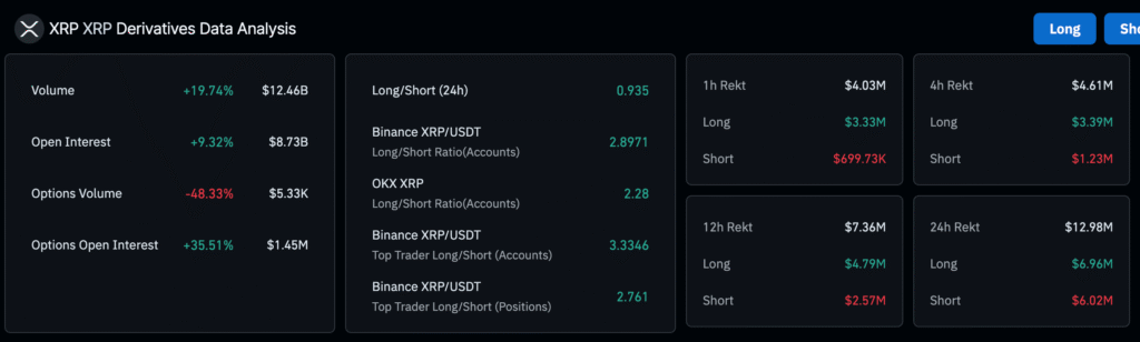 Open interest in XRP derivatives rose 9% to $8 billion, and trading volume climbed 20% to $12.5 million, indicating strong speculative demand amid a broader crypto rally sparked by lower-than-expected U.S. July inflation and growing expectations for a September Fed rate cut.