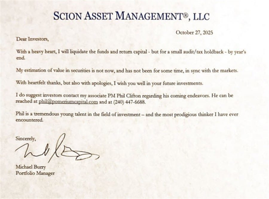 • Market players: Michael Burry is closing his hedge fund and moving to a family-office structure after Q3 option positions underperformed.