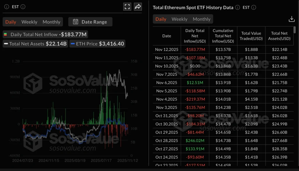 Ethereum ETFs saw $184 million in outflows, extending a three-day losing streak.