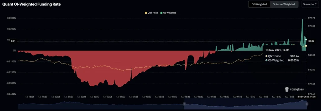 CoinGlass data show the Open Interest–weighted funding rate at 0.0103%, slightly below earlier highs of 0.0291% but still positive, indicating bulls are paying to maintain long exposure. Combined with rising long positions and reduced short interest, QNT’s technical outlook suggests growing demand from both large holders and retail traders.