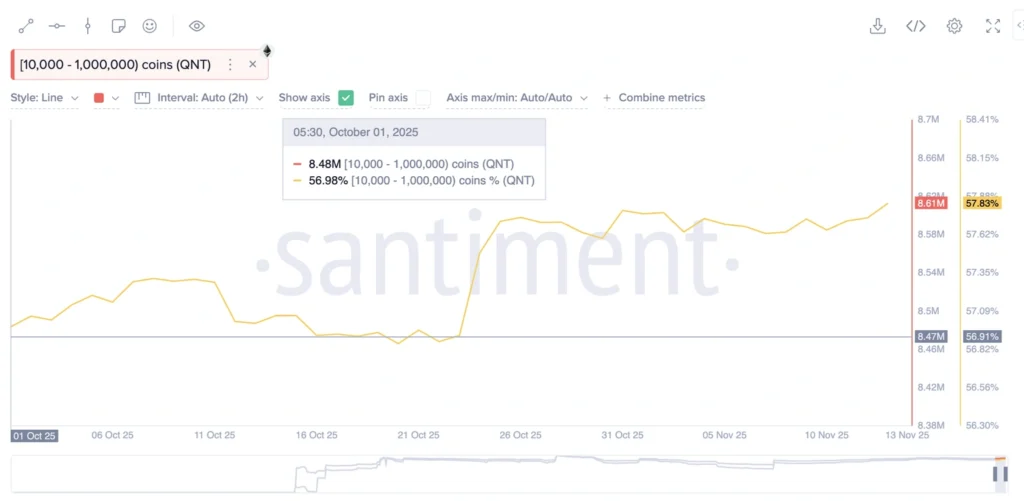 According to Santiment, wallets holding 10,000 to 1 million QNT now control 57.83% of supply, up from 56.98% in early October — an increase of about 130,000 QNT (8.48M → 8.61M). This accumulation implies institutional and whale confidence ahead of a potential breakout.