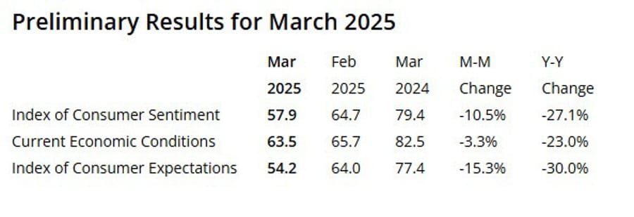 The University of Michigan’s preliminary consumer sentiment index for March came in at 57.9, significantly below the 63.1 estimate, and the lowest reading since November 2022.