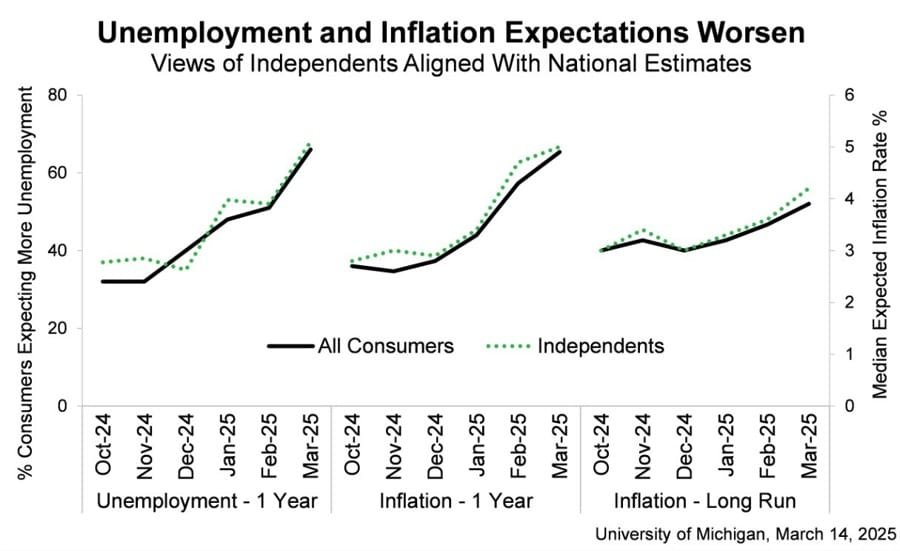 Consumer sentiment slid another 11% this month, with declines seen consistently across all groups by age, education, income, wealth, political affiliations, and geographic regions. Sentiment has now fallen for three consecutive months and is currently down 22% from December 2024. While current economic conditions were little changed, expectations for the future deteriorated across multiple facets of the economy, including personal finances, labor markets, inflation, business conditions, and stock markets. Many consumers cited the high level of uncertainty around policy and other economic factors; frequent gyrations in economic policies make it very difficult for consumers to plan for the future, regardless of one’s policy preferences. Consumers from all three political affiliations are in agreement that the outlook has weakened since February. Despite their greater confidence following the election, Republicans posted a sizable 10% decline in their expectations index in March. For Independents and Democrats, the expectations index declined an even steeper 12 and 24%, respectively.
