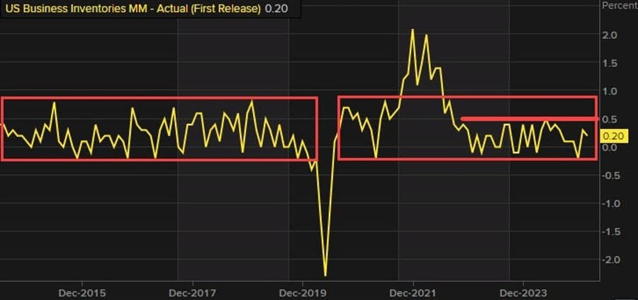 Business inventories rose just 0.1% in March, slightly below the 0.2% forecast and a slowdown from February’s +0.2% pace. Data from the US Census Bureau provided further insights into inventory and sales activity.