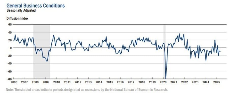 The Empire State Manufacturing Index fell for the third month in a row, hitting -9.2 in May, slightly better than the -10.0 expected. Key takeaways:
