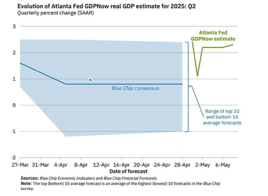 The Atlanta Fed’s GDPNow model revised its Q2 2025 growth estimate to 2.5%, up from the previous 2.3%. The upward adjustment reflects firmer economic data and moderate resilience in both business activity and consumer spending, despite ongoing trade uncertainty and monetary tightening.