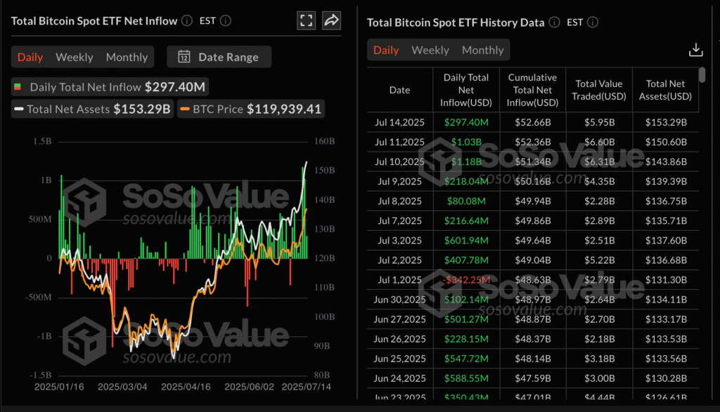Recent ETF inflows helped fuel Bitcoin’s breakout: spot ETFs saw over $1 billion in inflows on both Thursday ($1.18 billion) and Friday ($1.03 billion). But inflows fell to $297 million on Monday as caution returned.