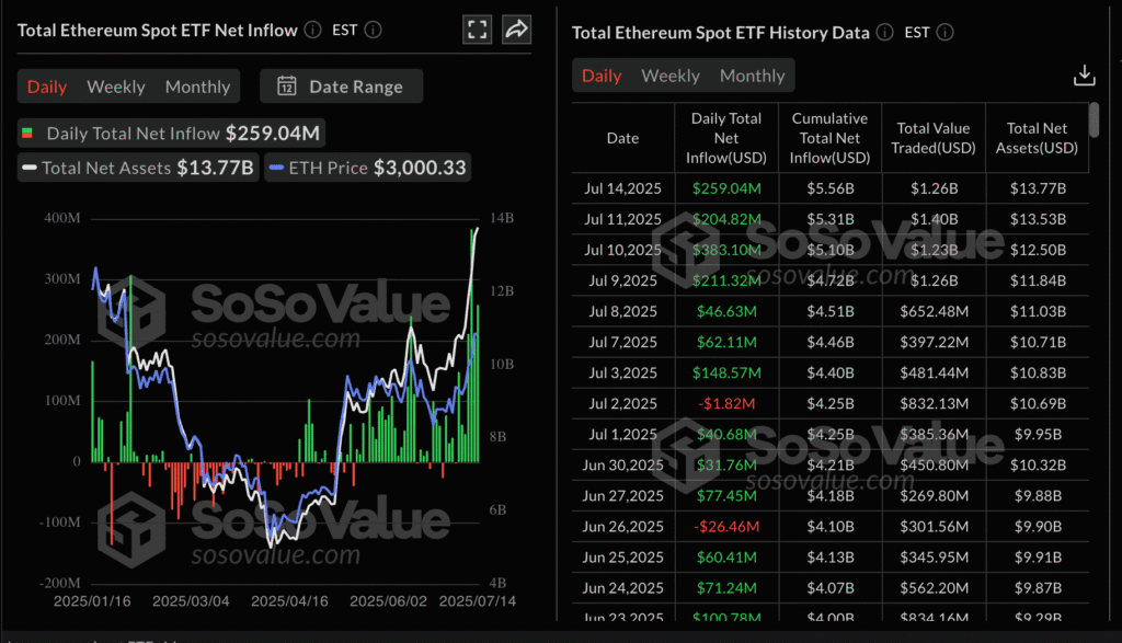Ethereum ETFs bucked the trend slightly, with Monday inflows rising to $259 million, marking a seventh straight day of gains.