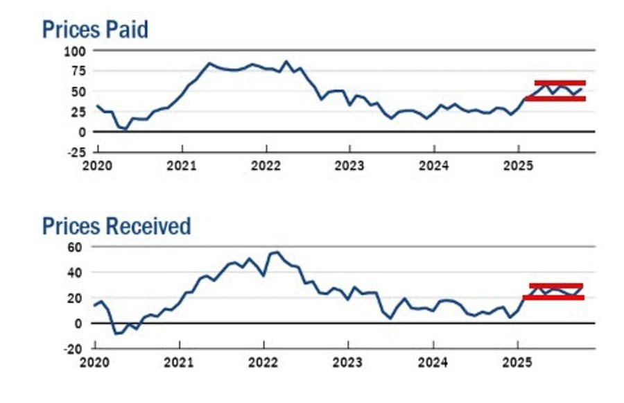 Prices paid accelerated to 52.4 and prices received to 27.2, indicating ongoing cost pressures.