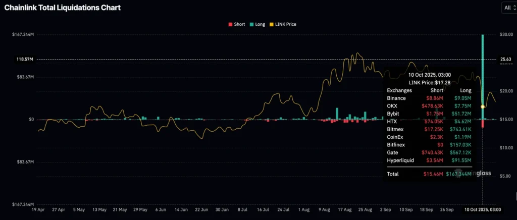 Friday’s market rout triggered Chainlink’s largest-ever deleveraging event, wiping out $167 million in long positions and $16 million in shorts. Open interest in futures briefly rebounded to about $737 million before slipping again to $704 million.