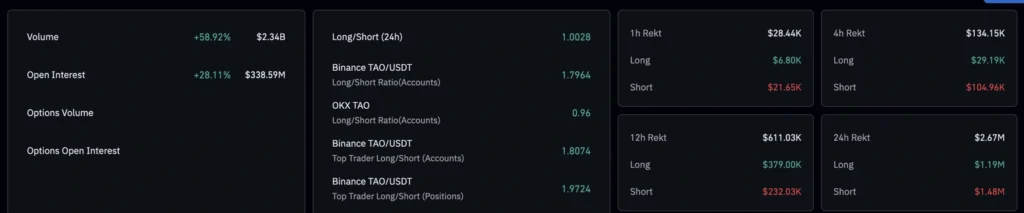 Rising retail participation and surging derivatives activity have fueled momentum. CoinGlass data show open interest up 28% in 24 hours to $338.6 million, while trading volume jumped 59% to $2.34 billion.