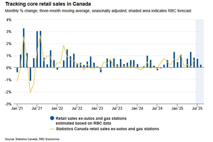 RBC cardholder data shows core retail sales +0.4% in August, while the headline fell -2.2%, weighed by cheaper gasoline.