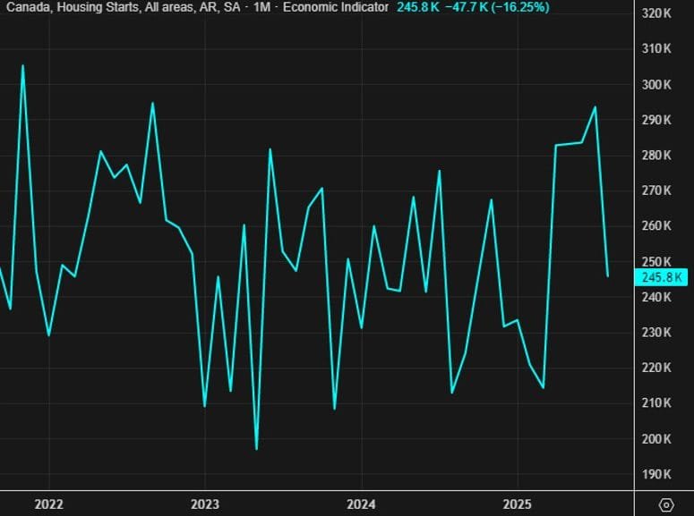 Canada recorded 245,800 housing starts in August, sharply below expectations of 277,500 and down 16% from July’s 294,100, according to CMHC data.