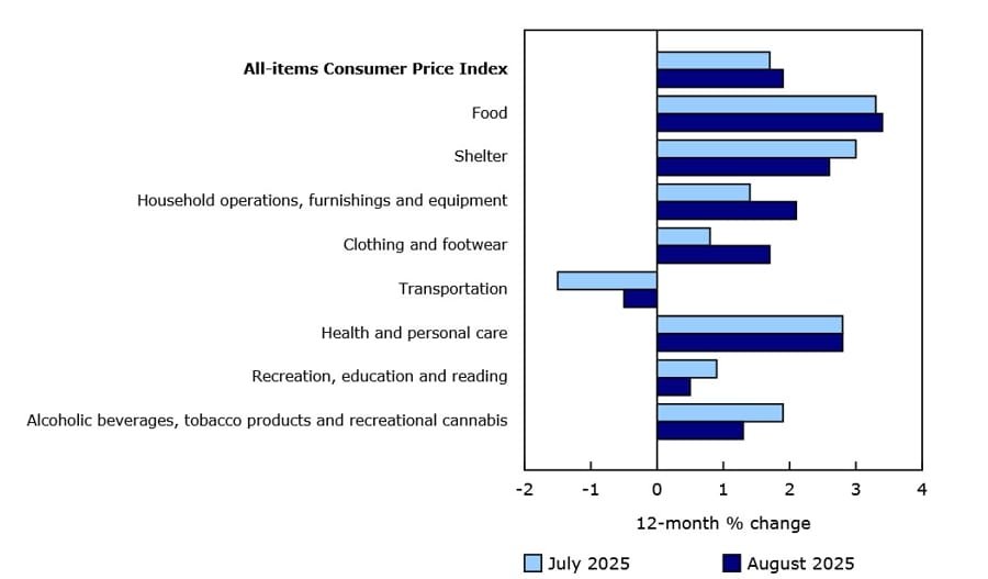 Canada’s consumer price index rose 1.9% in August from a year earlier, slightly softer than the 2.0% forecast. Prices fell 0.1% on the month, versus expectations of a 0.1% increase.