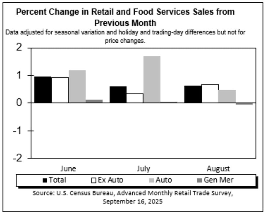 • Retail sales: +0.6% in August (triple estimates), fueling GDP upgrades; Atlanta Fed’s GDPNow raised to 3.4%.