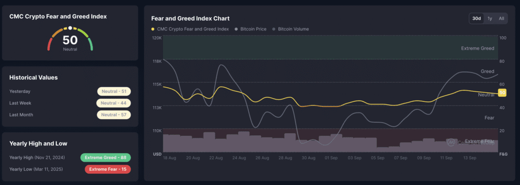 The Crypto Fear and Greed Index sits at 50, reflecting neutral sentiment ahead of the Fed’s expected rate cut. Analysts say this “wait-and-see” mood puts PI at a crossroads, with risks of losing bullish momentum if market catalysts don’t materialize.