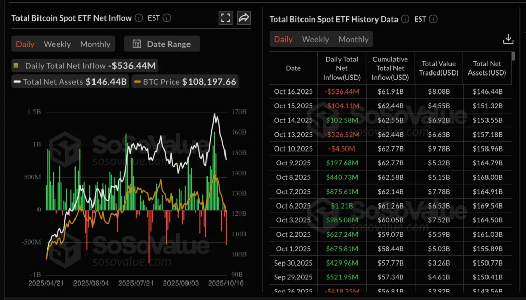 ETF data suggest institutional interest remains weak. U.S. Bitcoin ETFs saw $536 million in outflows Thursday — the largest since August 19 — following $104 million the prior day.